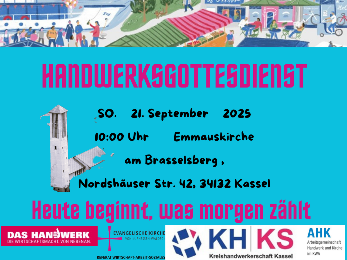 Passend am Tag des Handwerks, am 21. September 2025 um 10:00 Uhr, findet zusammen mit der Kreishandwerkerschaft Kassel, der Emmausgemeinde am Brasselberg in Kassel und der Arbeitsgemeinschaft Handwerk und Kirche ein Handwerksgottesdienst statt.