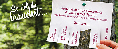 Unter dem Motto «So viel du brauchst...» lädt die Evangelische Kirche von Kurhessen-Waldeck auch in diesem Jahr zum «Klimafasten» ein. Die Aktion «Fasten für Klimaschutz und Klimagerechtigkeit» soll Gemeindeglieder dazu motivieren, in der Passionszeit einen klimafreundlicheren Lebensstil zu erproben.