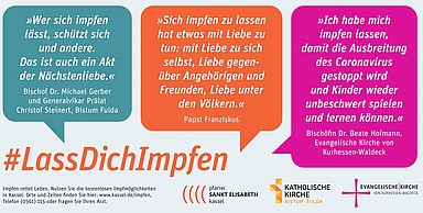 Mit Transparenten und Postkarten motiviert die katholische Kirchengemeinde Sankt Elisabeth an ihren Kirchen in Kassel für das Impfen gegen Covid19. Verbunden mit dem Slogan #LassDichImpfen sind Zitate von Papst Franziskus, Bischof Dr. Michael Gerber und Generalvikar Prälat Christof Steinert (Bistum Fulda) sowie Bischöfin Dr. Beate Hofmann (Evangelische Kirche von Kurhessen-Waldeck) zu sehen.
