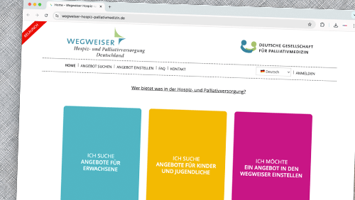 Der Wegweiser der Hospiz- und Palliativersorgung Deutschland ist ein Portal für Betroffene und Hilfesuchende, um bundesweit Hilfestellung für die Palliativberatung und -versorgung zu finden. Betroffene, Angehörige, aber auch Beratungsstellen, Einrichtungen sowie Netzwerke sollen mit dem Wegweiser Unterstützung bei der zeitnahen Suche nach Angeboten der Hospiz- und Palliativversorgung erhalten.