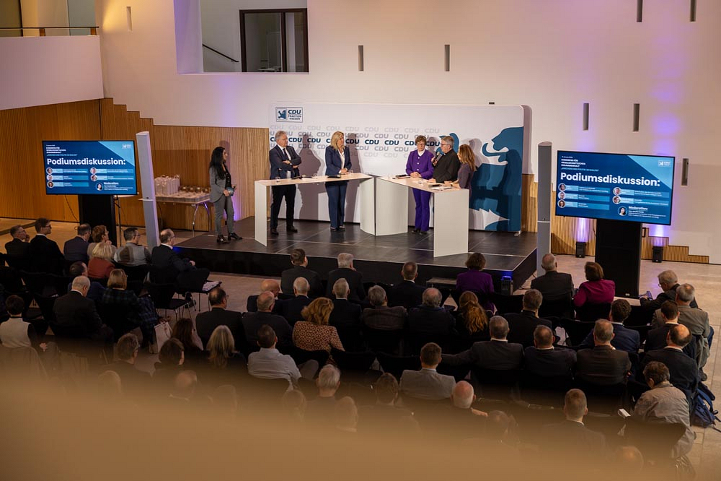 Zum Abschluss reflektierte ein hochrangig besetztes Podium mit Fraktionsvorsitzender Ines Claus, Botschafter Dr. Kahl, Bischöfin Prof. Dr. Beate Hofmann, Bischof Prof. Dr. Peter Kohlgraf sowie der Hanauer Stadträtin Isabelle Hemsley die Erkenntnisse und Erfahrungen des Tages.