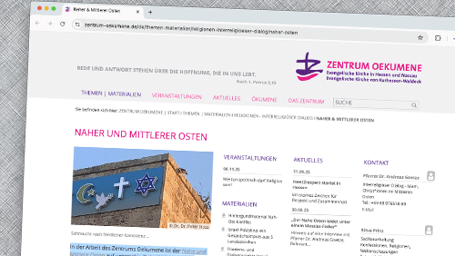 Das Zentrum Oekumene der Evangelischen Kirche in Hessen und Nassau und der Evangelischen Kirche von Kurhessen-Waldeck ist in vielfältiger Weise mit dem Nahen und Mittleren Osten verbunden. Es fördert den jüdisch-christlichen, christlich-islamischen und trialogischen Dialog und unterstützt Friedens- und Versöhnungsprojekte vor Ort. Ziel ist die Verständigung zwischen Jüdinnen und Juden, Christinnen und Musliminnen sowie zwischen Israelis und Palästinenser*innen.