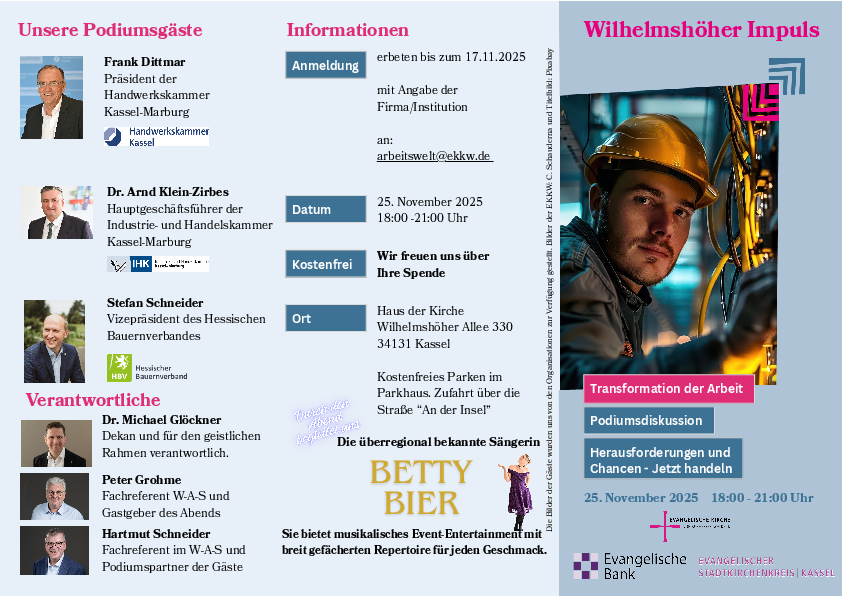 Anmeldung möglichst bis 17.11. mit Angabe der Firma/Institution: arbeitswelt@ekkw.de
